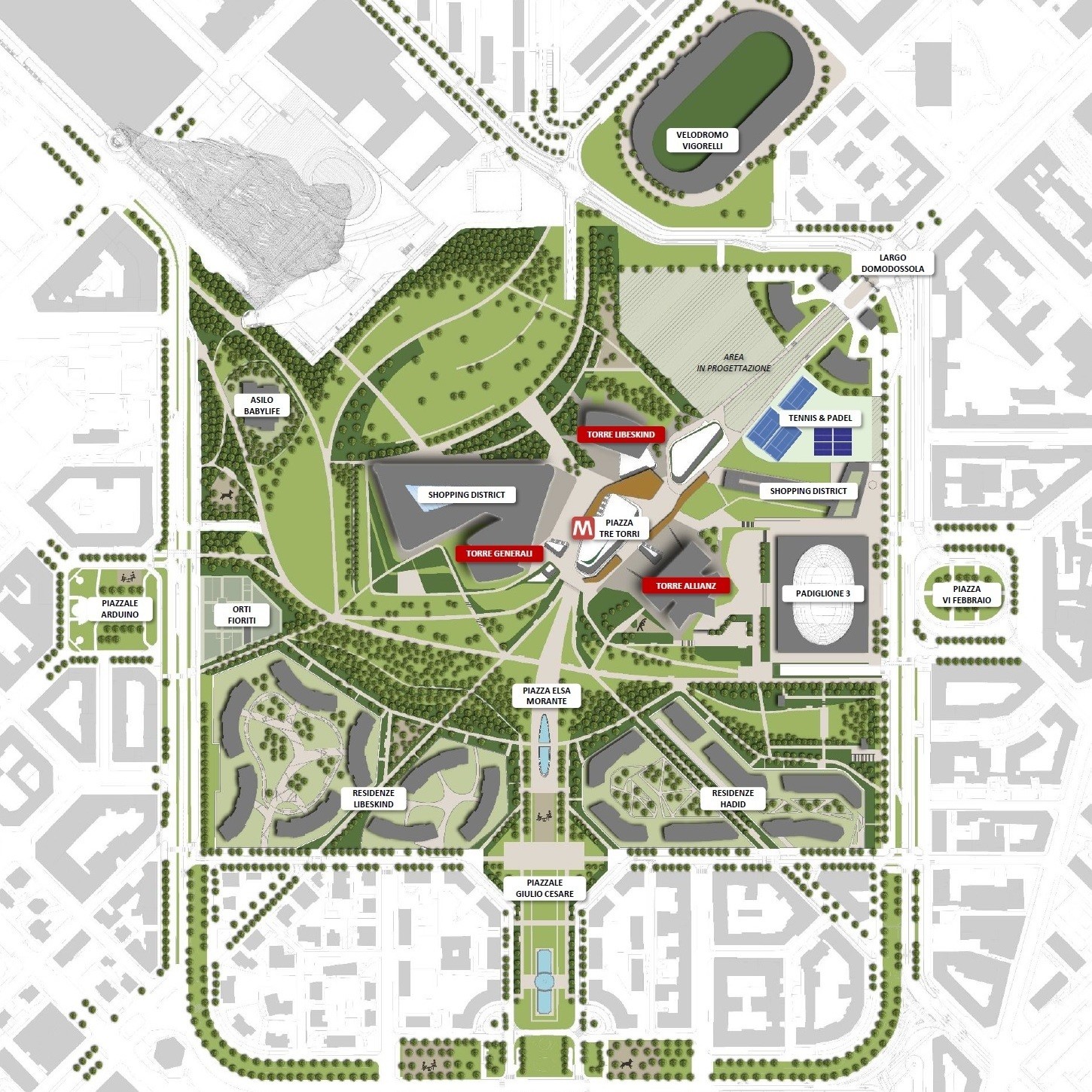 Suddivisa in zone, ci dà un’idea del complesso architettonico e del suo sviluppo, della sua dimensione, della parte dedicata allo shopping, di quella delle residenze e della zona business.