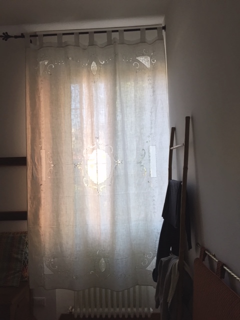 Difficili da fotografare perché stanno davanti alla fonte di luce e tendono a bruciare la foto. Magari qualcuno di voi mi sa suggerire qualche trucco… intanto però vi potete fare un’idea. Perché sono tende che hanno una storia, e probabilmente anche tante storie. Sono state ricamate a mano, e ci dev’essere voluta una quantità enorme di tempo. Stavano in casa dei miei nonni, che sono morti negli anni ottanta, e quindi devono essere state fatte negli anni cinquanta, quando le famiglie normali come quella dei miei nonni stavano riprendendo una vita normale e “rimpannucciandosi”, come dicevano loro. Qualcuno era riuscito a comprare casa e metter su le tende. Chi sapeva fare qualcosa lo faceva. La nonna lavorava a maglia e la zia Giustì ricamava, attività un po’ più futile ma che si applicava alle lenzuola, alle tovaglie, ai tovaglioli e alle tende. Le tende dovevano essere davvero un lusso.