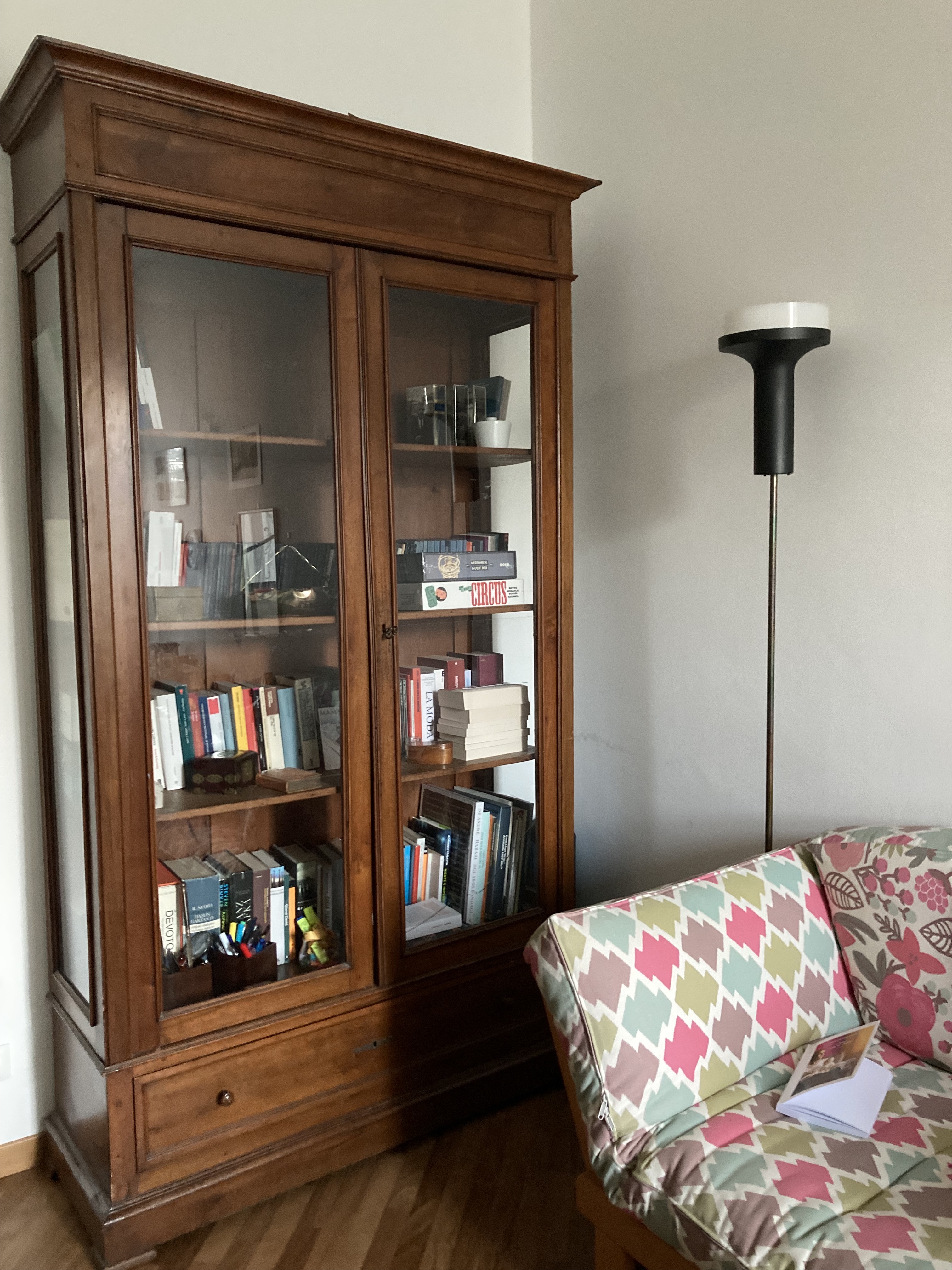 Poi per caso sono andata da Patrizia, un’amica che vende i prodotti cosmetici Ringana, di cui sono sicura di avervi parlato perché sono i cosmetici che uso abitualmente. Tutti naturali, tutti freschi, azienda veramente sostenibile dall’inizio alla fine del ciclo produttivo. Sono andata da Patrizia per prendere la crema per le mani, che come la temperatura scende sotto i 20 gradi ho i geloni ai pollici e l’unico modo non per eliminarli ma per far sì che non sanguinino e non mi facciano male è, oltre a usare sempre la crema Ringana, farsi una specie di impacco la notte (cioè metto un bel po’ di crema e poi dormo con i guanti di cotone). Insomma arrivo a casa di Patrizia e mi trovo davanti questa bella vetrina antica, lei sta risistemando casa, è tutto sottosopra, la vetrina è vuota e messa lì nell’ingresso in attesa di destinazione. Patrizia dice che non sa dove metterla, nella casa rinnovata. E io le dico beh la prendo io. Mi è venuto così, di getto. Mi son detta ecco perché non ho comprato un’altra libreria, c’era questa che mi aspettava. E Patrizia è stata contenta. Perché la vetrina veniva da un antiquario di Firenze ed era stata con lei e famiglia per un bel po’ di tempo, era un peccato svenderla o infilarla in una cantina (sempre che ci stesse).